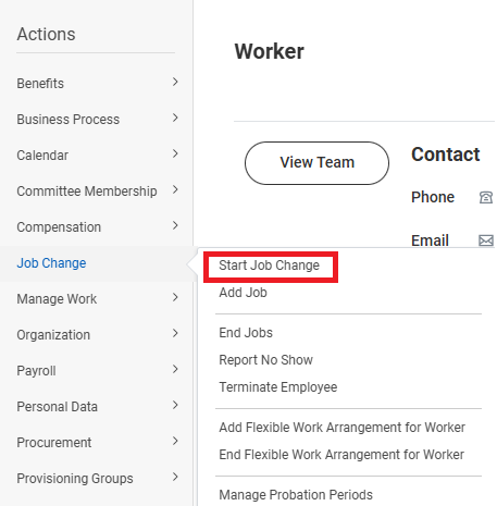 Initiating the Job Change now uses the Start Job Change task either in Search field or Click the Related Actions icon > Job Change and then select Start Job Change(From the related actions icon on the employee’s profile).